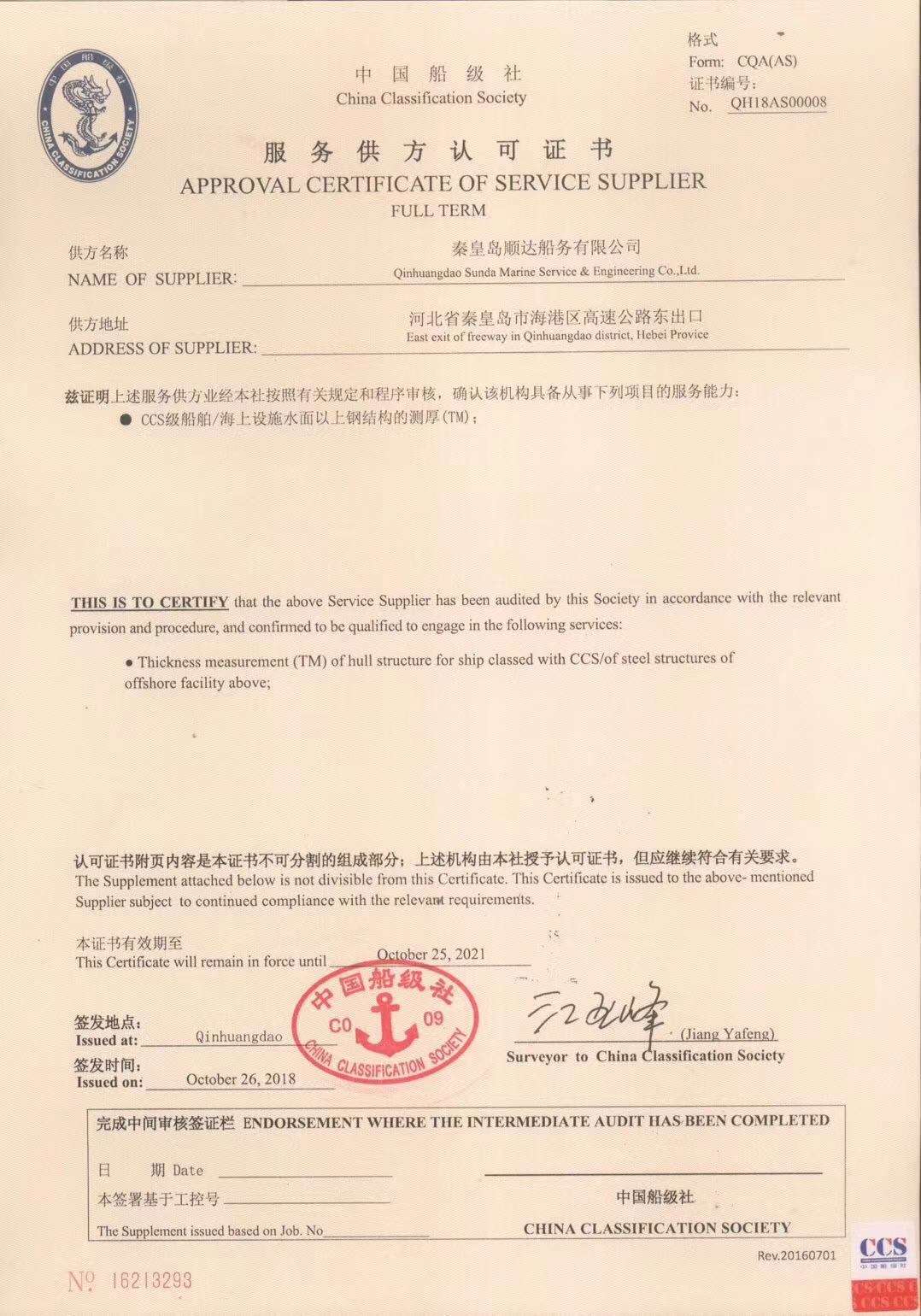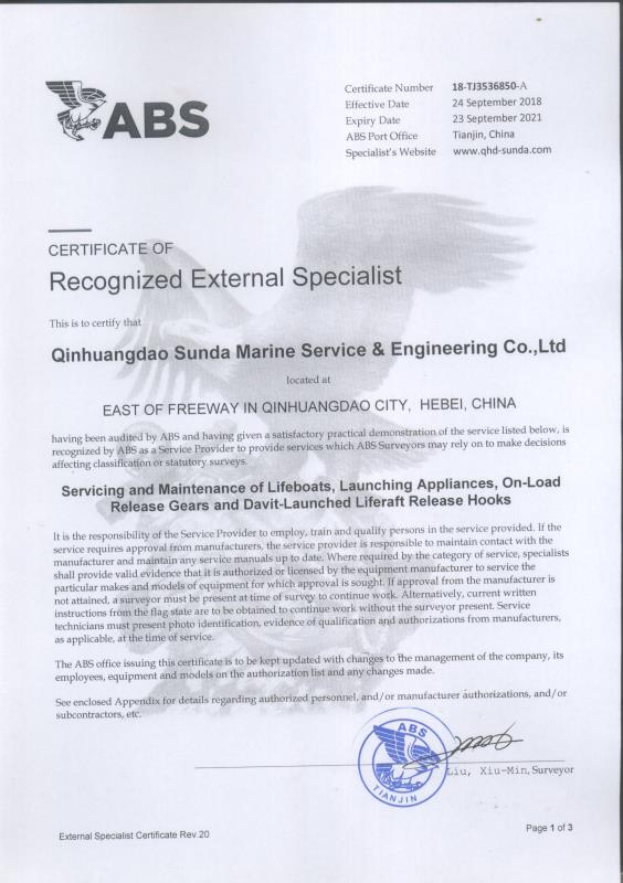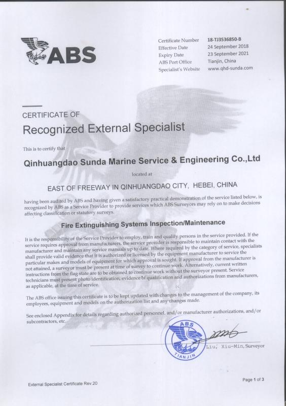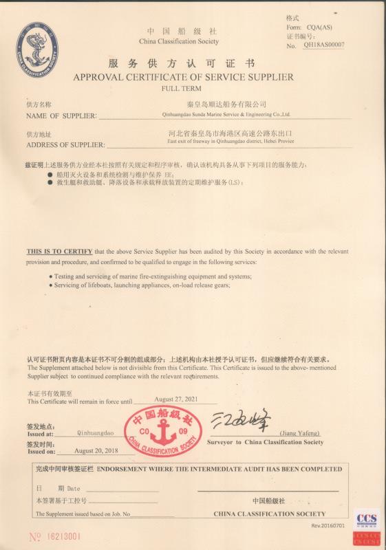 秦皇島順達(dá)船務(wù)有限公司位于美麗的海濱城市、中國北方著名的能源輸出大港--秦皇島。公司從事于船舶修理、物料供應(yīng)、水下檢測、船體測厚、消防救生設(shè)備及救生艇檢驗、電氣自動化修理等服務(wù)。 公司自1997年成立至今,先后為國內(nèi)外船東修理、檢驗各類船舶萬余艘,積累了豐富的施工經(jīng)驗。公司現(xiàn)有場地100余畝,員工30余人,以及工程用車若干臺。我們公司一直本著嚴(yán)以律己、真誠待人、精益求精、信譽至上的經(jīng)營理念,以優(yōu)質(zhì)的服務(wù)、專業(yè)的施工、合理的收費,得到了國內(nèi)外船東的廣泛認(rèn)可,贏得了良好的口碑和信譽。 公司已取得了中國船級社(CCS)、美國船級社(ABS)、日本船級社(NK)、德國船級社(DNV GL)等各個船級社的消防救生和救生艇檢驗資質(zhì), ...
